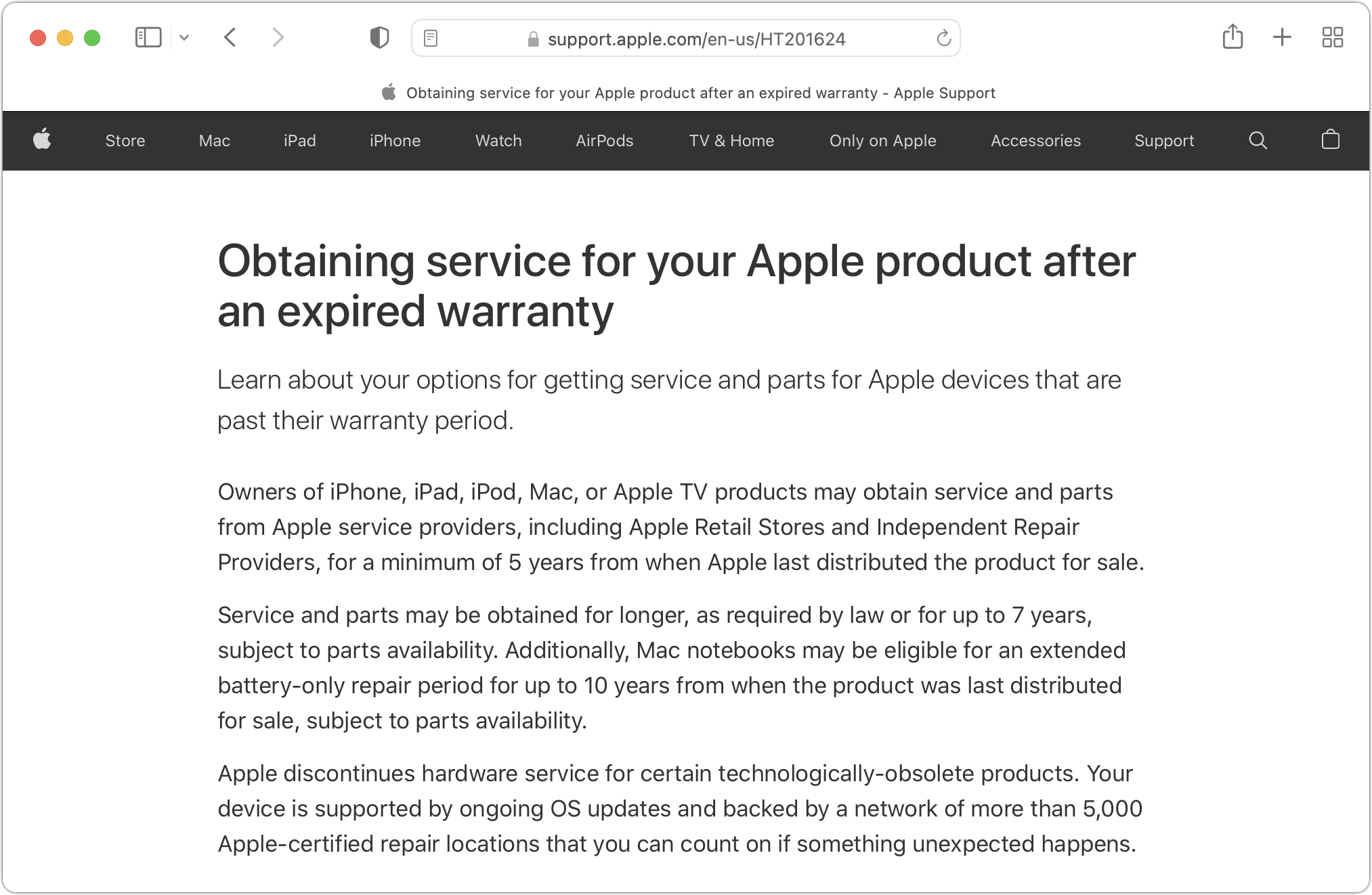 All Apple products fall into one of three categories: current, vintage, and obsolete. Current products, which Apple defines as those that were sold within the last 5 years, are eligible for service and parts from Apple, Apple Authorized Service Providers, and Independent Repair Providers. In other words, if you bought your Mac new within the last 5 years, you won’t have any problem getting Apple to fix it.