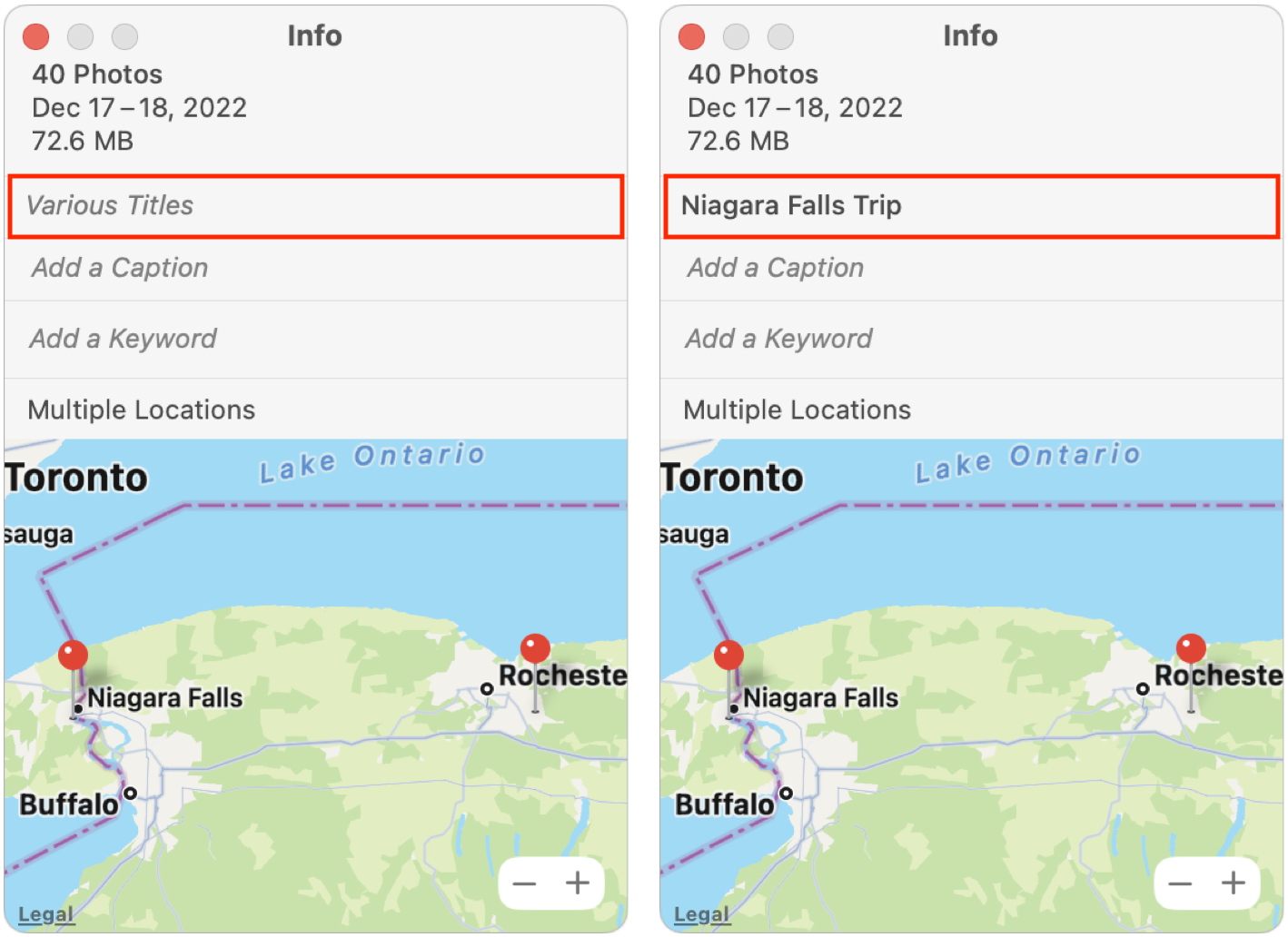 No photos, scanned or taken with an iPhone, will automatically have useful title data assigned to them. At best, the title might be the same as the image’s filename, something unhelpful like IMG_3343.JPG. In Photos’ predecessor iPhoto, Apple provided a way of changing the titles of selected photos and appending a sequential number to each image. That way, you could have Niagara Falls Trip 1, Niagara Falls Trip 2, and so on.