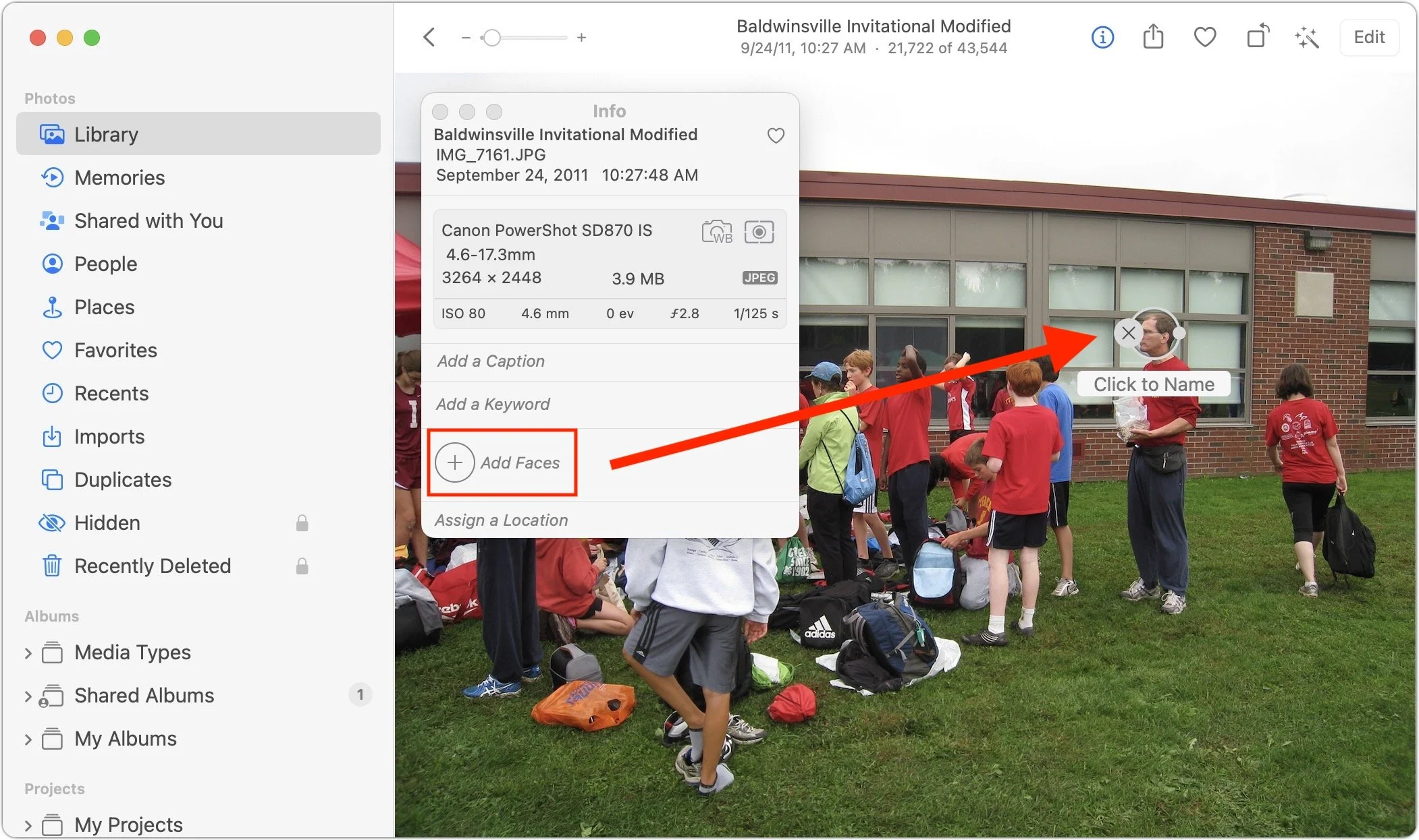 3. When there’s no tag under the person’s face, you’ll have to add one manually. Choose Window > Info to bring up the Info window, click the Add Faces button, click the image again (surprising, but necessary), drag the Click to Name circle over the face of the person to identify, and then type a name in the box.