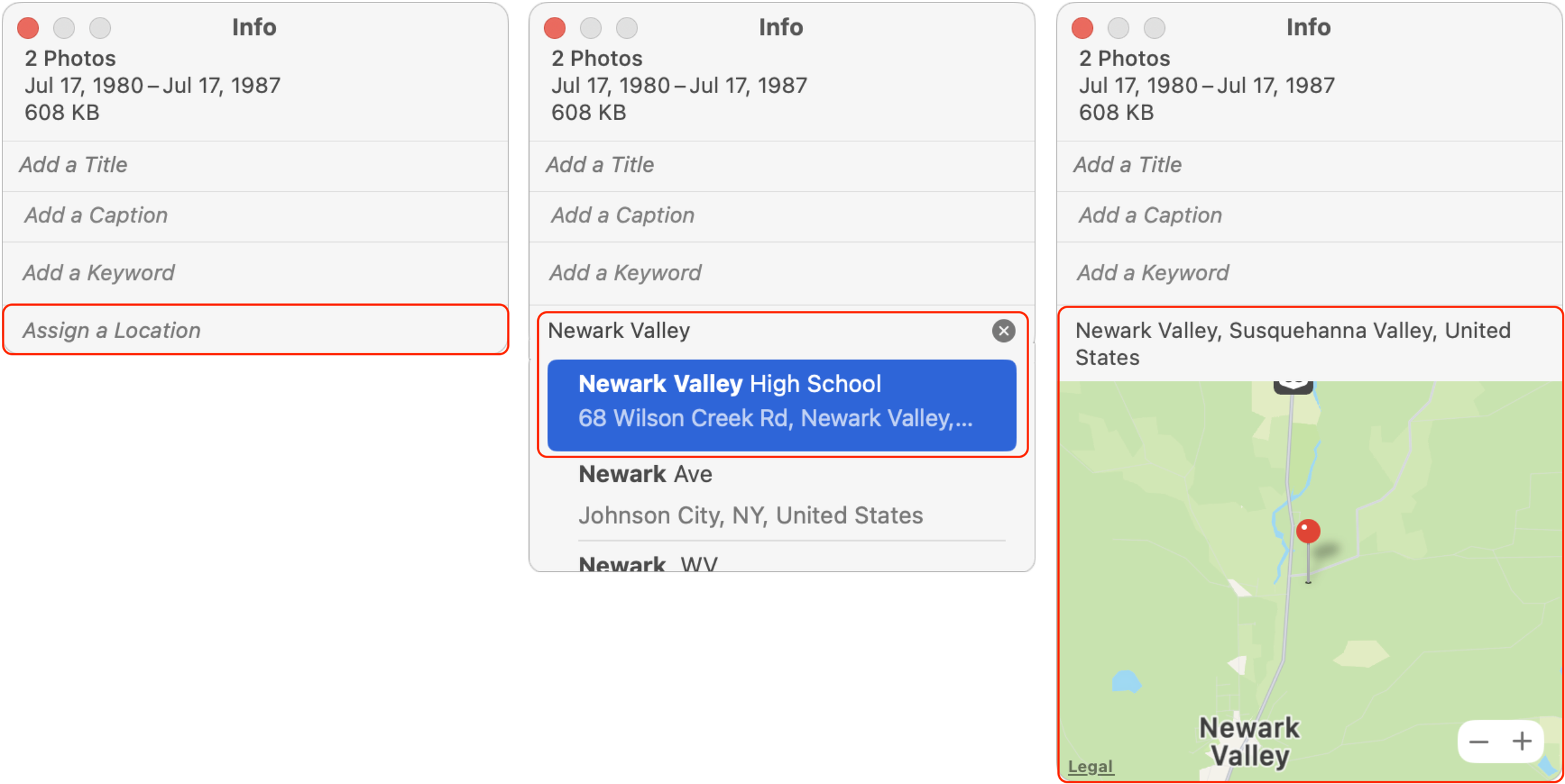 Scanned photos and those taken with most digital cameras won’t have location metadata showing where the photo was taken. With many photos, you may not know the precise location—who remembers where that picnic in 1980 was held?—but you can probably specify the city or state/province. The process for adding locations is similar to adding titles.
