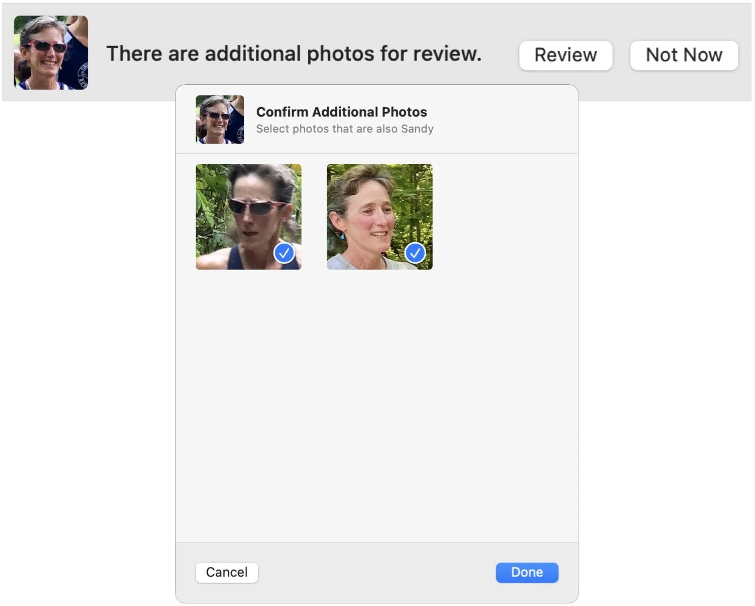 In the People album, double-click a person’s face. At the top of the window, Photos may display a banner saying that there are additional photos to review. If it does, click Review, and in the dialog that appears, deselect any photos that aren’t of the person before clicking Done. The banner won’t appear when there are no more photos to check for that person.