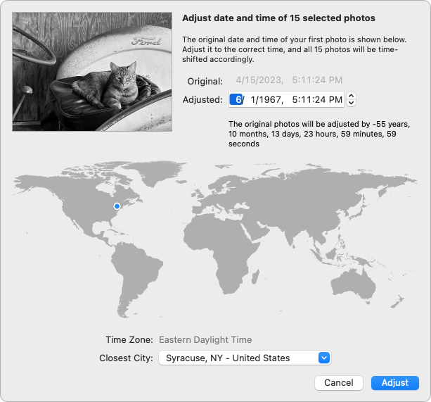 It’s important to note that this doesn’t change the date and time to what you enter exactly. Instead, it adjusts each photo’s date and time by the amount specified. In all likelihood, the selected photos have slightly different times and possibly dates, so adjusting them by the same amount means they’ll retain their basic order. In the screenshot above, you can see that each photo’s date will move more than 55 years into the past to when that tractor was newer.