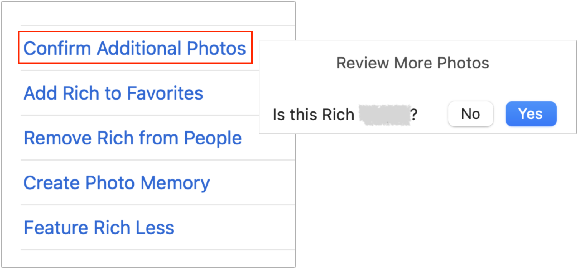 In the People album, double-click a person’s face. Scroll to the bottom of the window, and click Confirm Additional Photos. If it has any photos that might be of that person, Photos displays the first one and asks at the top of the screen if the photo is of the desired person. Click Yes or No as appropriate for each photo that appears. Often, identifying a particular face as being associated with the person will add more photos. When you finish, click the Done button at the top of the window.