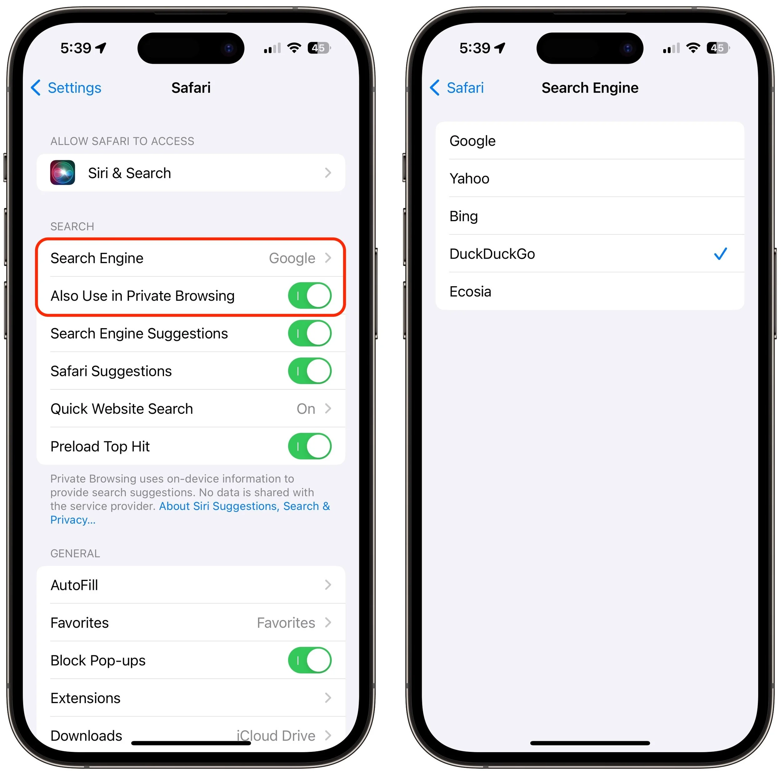 On the iPhone and iPad, go to Settings > Safari > Search Engine. Again, if you want a different search engine in Private Browsing tabs, turn off Also Use in Private Browsing and choose another option.