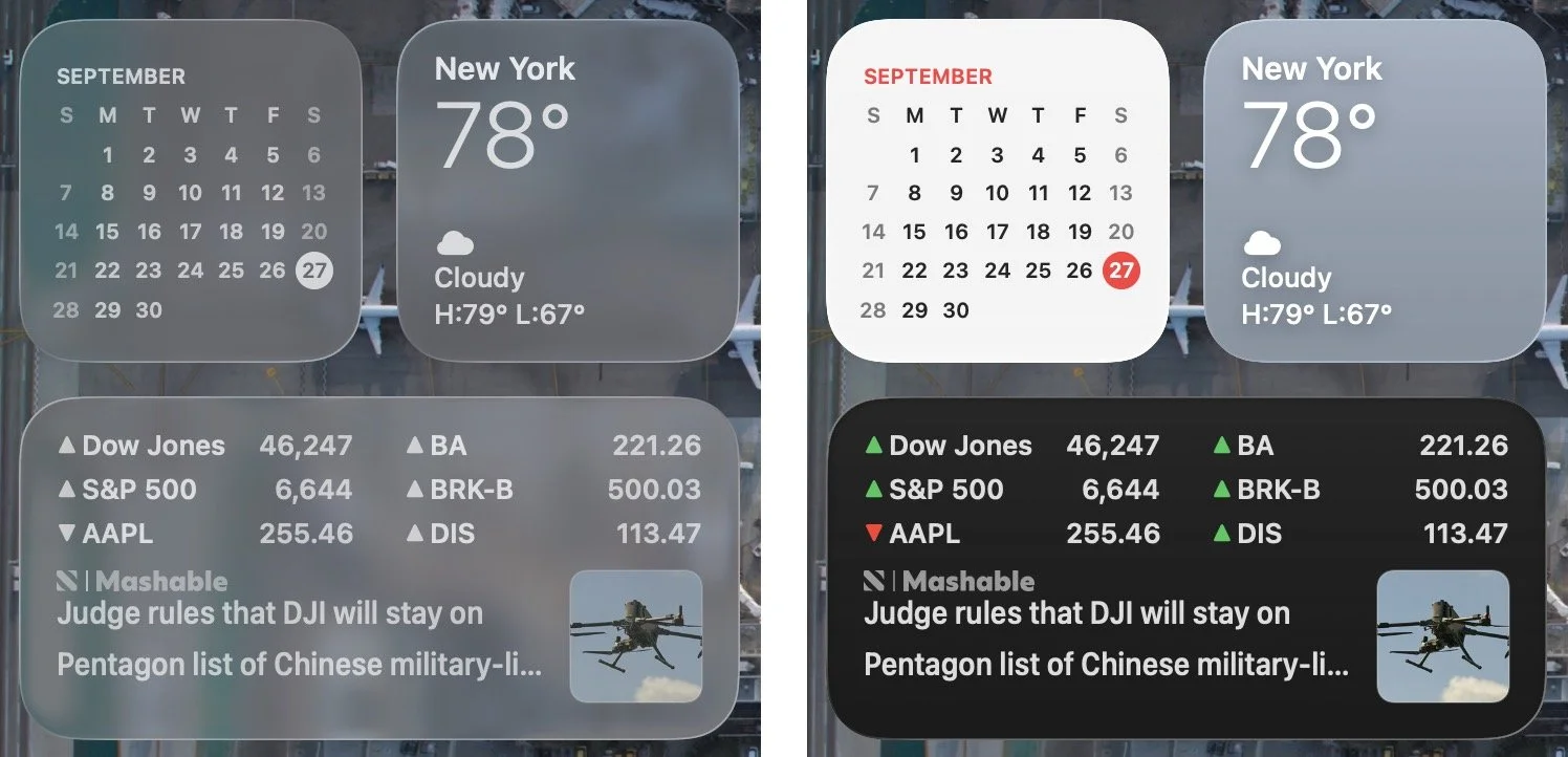 Widget style: Desktop widgets are now mostly transparent when any window is open on the desktop, and they become solid only when the last window is closed or hidden. You can adjust this setting in System Settings > Desktop & Dock > Dim widgets on desktop. Widgets also adopt the same clear or tinted style used by icons.