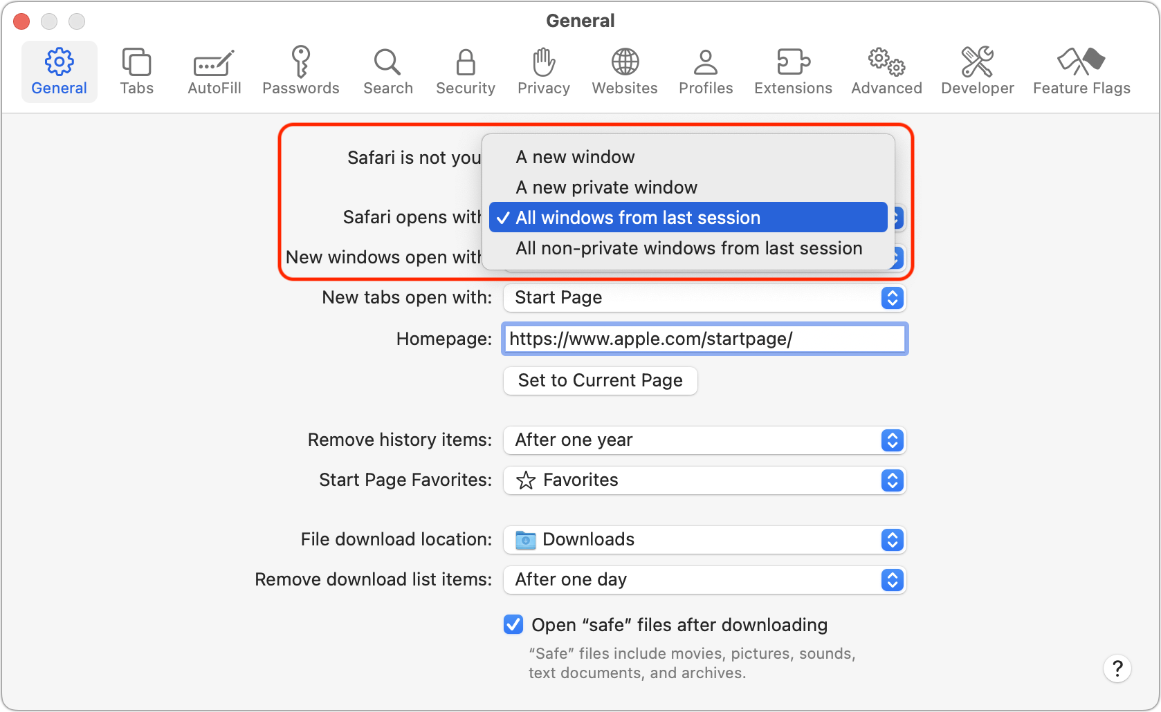 Custom session restore: Some apps manage session restoration on their own, most notably Safari and apps built with the Electron framework, such as Slack, Discord, and Notion. For instance, in Safari > Settings > General > Safari opens with, you can choose a new window, a new private window, all windows from the last session, or all non-private windows from the last session. With such apps, look for internal settings that control their behavior.