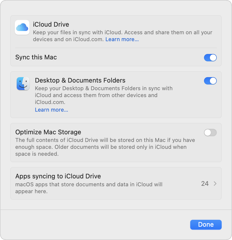 iCloud Drive: Turn off System Settings > Your Name > iCloud > iCloud Drive > Optimize Mac Storage.