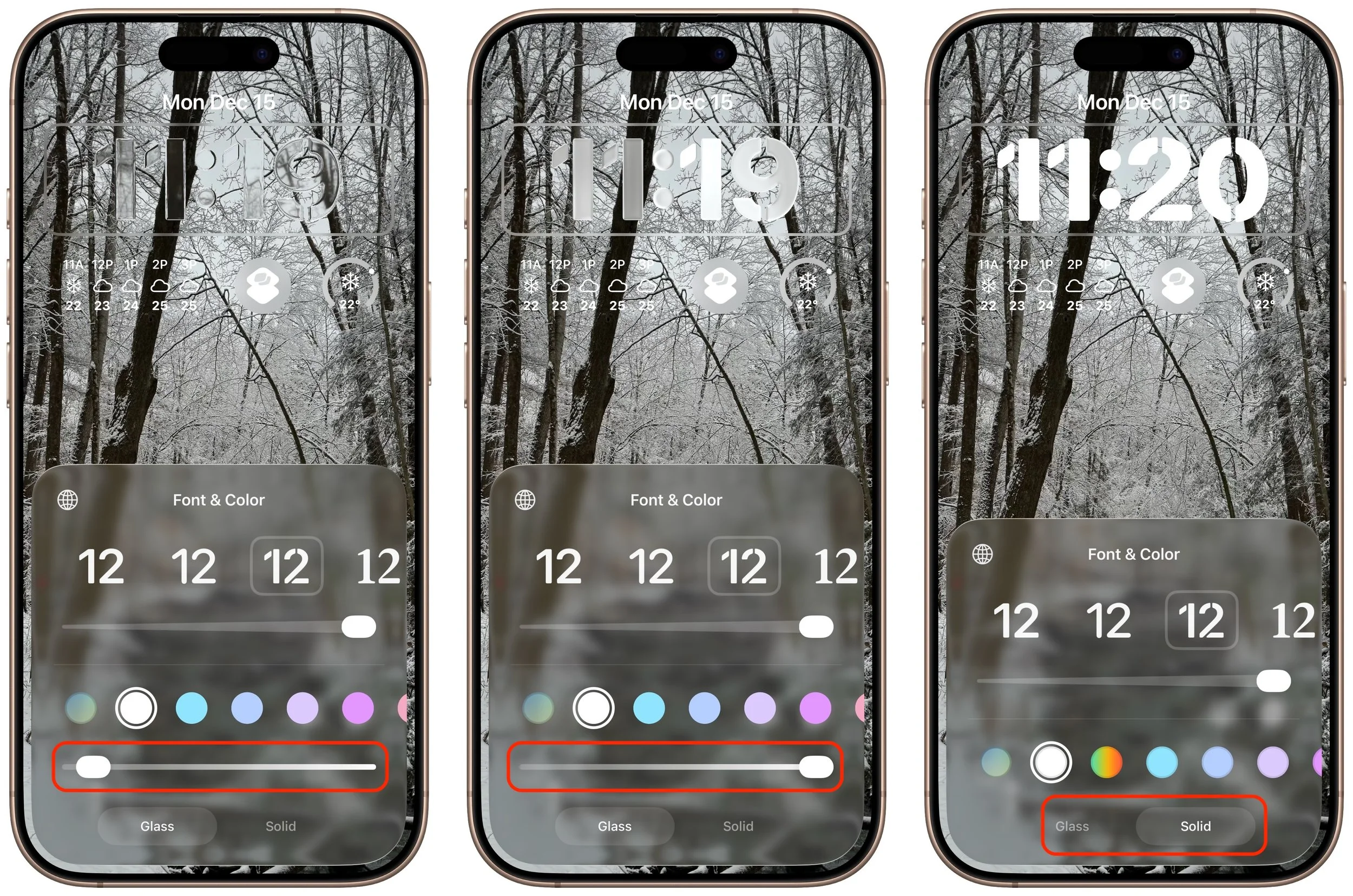 One place where the Liquid Glass transparency in iOS 26 and iPadOS 26 can be annoying is the time display on the Lock Screen. Liquid Glass tries—but often fails—to adjust the clock’s transparency so it’s readable over whatever photo you chose or the Photo Shuffle option displayed. Starting in iOS 26.2 and iPadOS 26.2, you can manually adjust the clock’s transparency: touch and hold the Lock Screen, tap Customize, tap the clock, tap Glass, and drag the Transparency slider (left and middle). If it's still not readable enough, you can switch to the previously available Solid view (right).